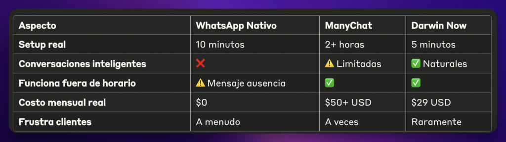 La realidad incómoda: Las opciones «gratuitas» tienen limitaciones tan severas que pueden crear más problemas de los que resuelven. Clientes frustrados, conversaciones interrumpidas y la sensación de que tu negocio no es profesional.
