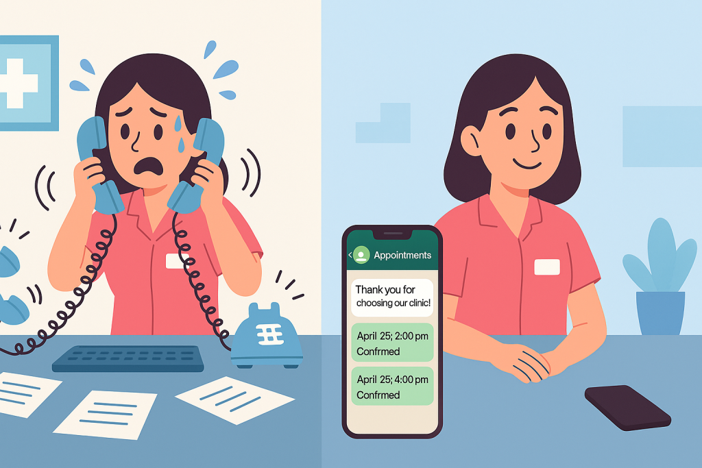 Cada mañana, las recepcionistas de clínicas enfrentan lo mismo: pacientes llamando y enviando mensajes ya sea para agendar, otros para confirmar, algunos para preguntar direcciones y muchos más para consultar horarios. Mientras tanto, se acumulan las tareas administrativas y los pacientes en sala de espera necesitan atención.